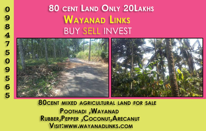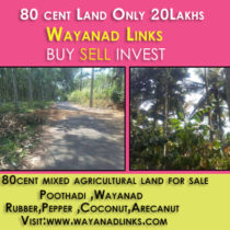 80 cents mixed agricultural land for sale at Poothadi, Wayanad. 25m tar road frontage,RUBBER,PEPPER ,COCONUT,arecanut are cultivated,electricity,public water facilities are available.Asking price:25000/cent.