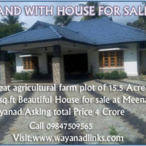 A great agricultural farm plot of 15.5 Acre with a 2000sq.ft Beautiful House for sale at Meenagadi.In this land 5 acre coffee,4 acre rubber plantations,4 acre paddy fields,1acre pond & in 3.5 acre coconut tree(230 No.) Betel nut tree(1270 No.) mixed yielding produced.And in this land a cow shed with machineries.Good road approach.6km from NH.5 bed room(2 rooms A/C) with 3attached bathroom.Asking total Price 4 Crore.